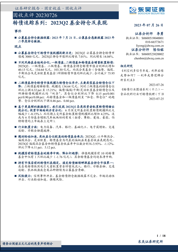【东吴证券】【20230726】转债追踪系列:2023Q2基金持仓及表现-18页