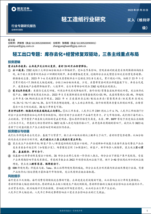 【国金证券】【20230723】轻工出口行业专题:库存去化+经营修复双驱动,三条主线重点布局-20页