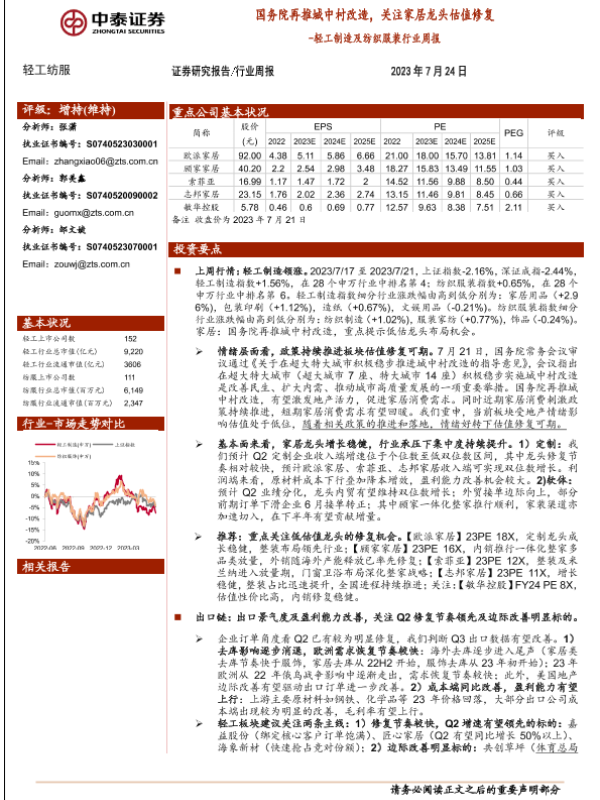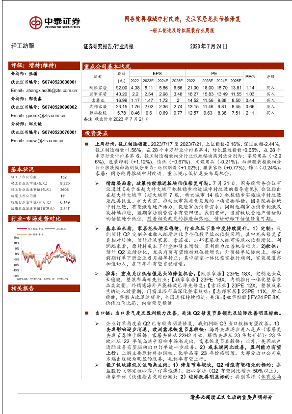 【中泰证券】【20230724】轻工制造及纺织服装行业周报:国务院再推城中村改造,关注家居龙头估值修复-20页