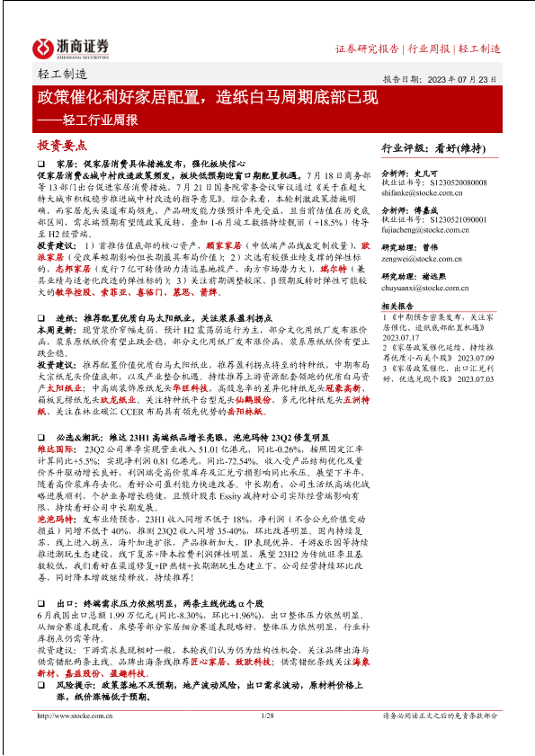 【浙商证券】【20230723】轻工行业周报:政策催化利好家居配置,造纸白马周期底部已现-28页
