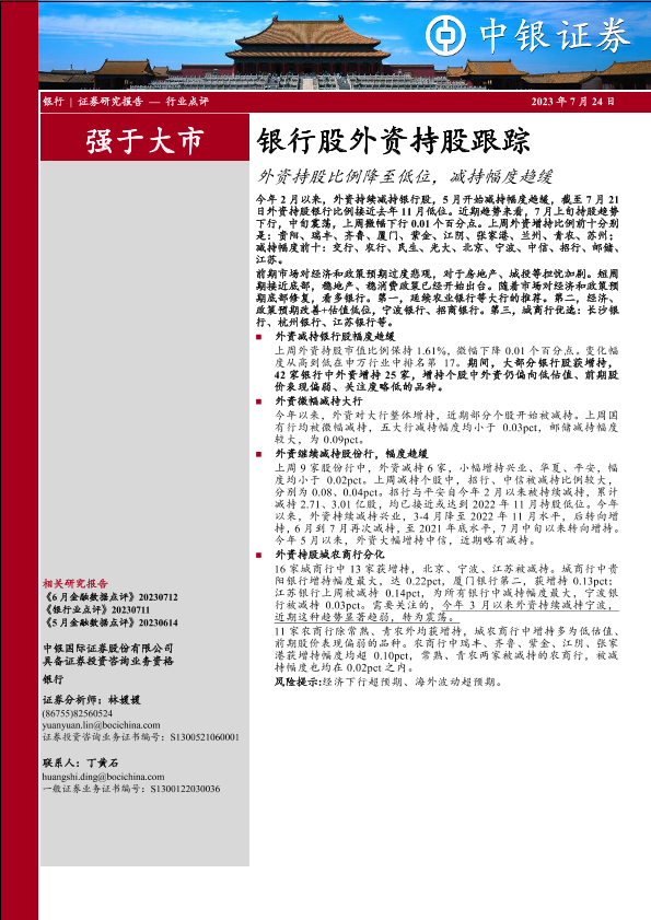 【中银证券】【20230724】银行业股外资持股跟踪:外资持股比例降至低位,减持幅度趋缓-19页