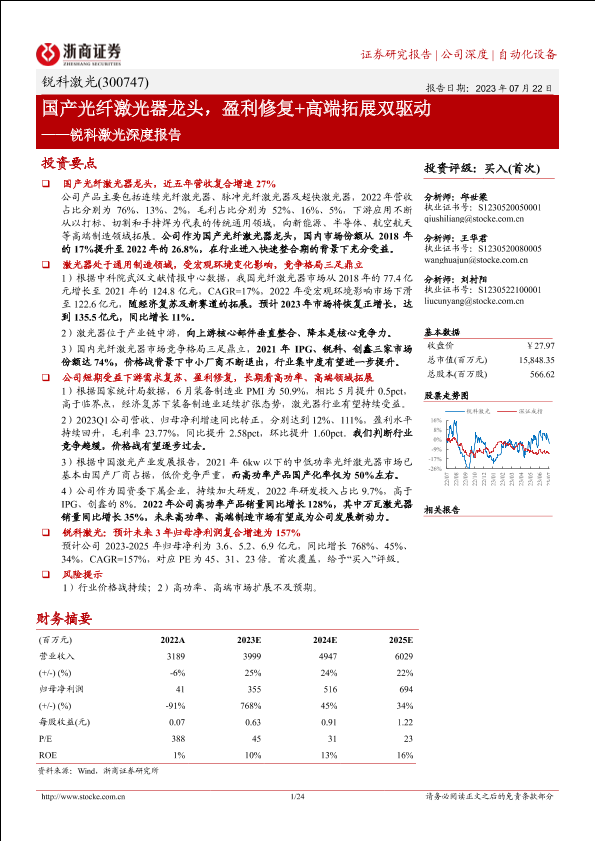 【浙商证券】【20230722】锐科激光深度报告:国产光纤激光器龙头,盈利修复+高端拓展双驱动-24页