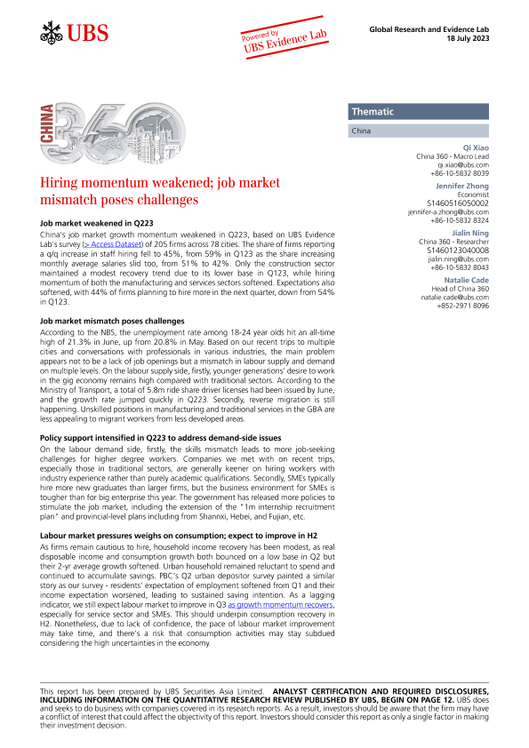 【UBS Securities Asia Limited】【20230718】UBS Equities-China 360 _ Hiring momentum weakened; job market mismatch poses challenges-15页