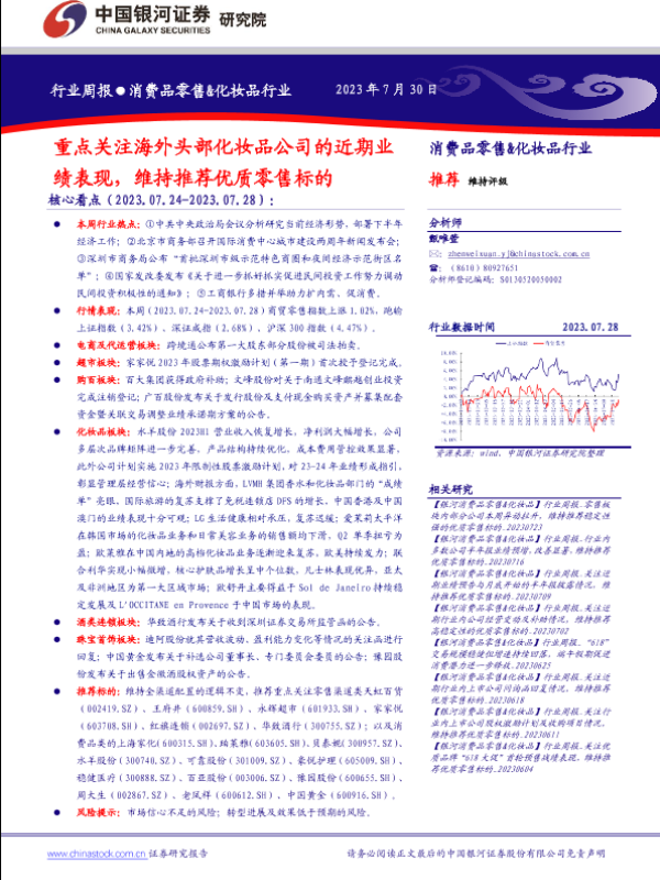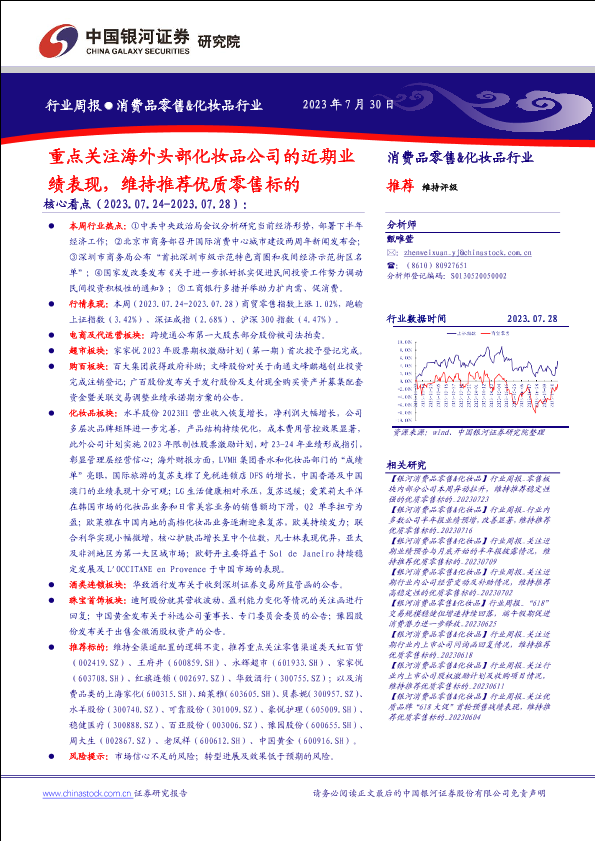 【银河证券】【20230730】消费品零售&化妆品行业行业周报:重点关注海外头部化妆品公司的近期业绩表现,维持推荐优质零售标的-36页