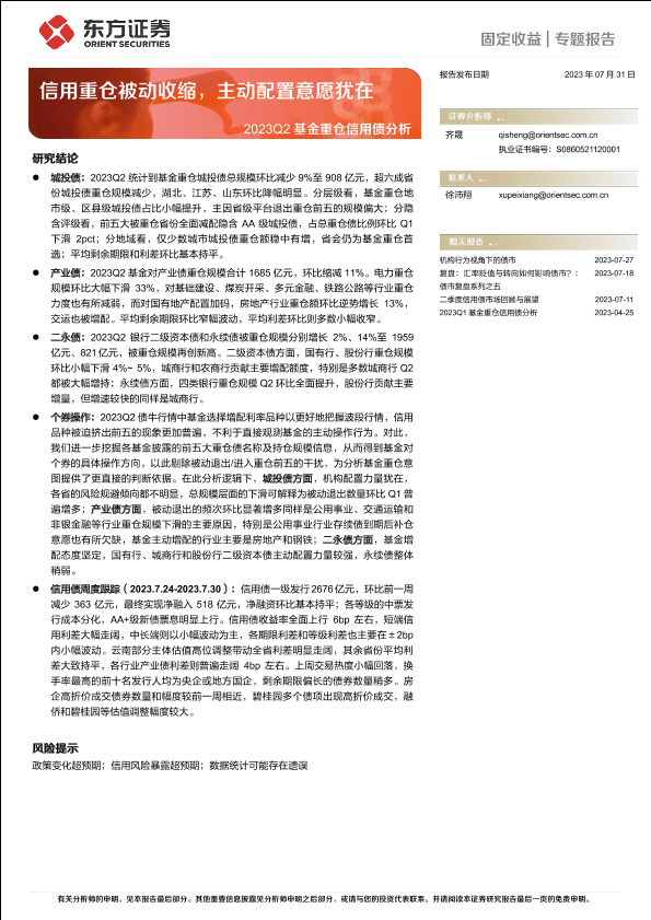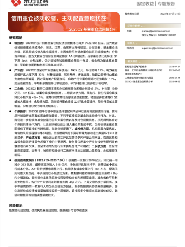 【东方证券】【20230731】2023Q2基金重仓信用债分析:信用重仓被动收缩,主动配置意愿犹在-23页