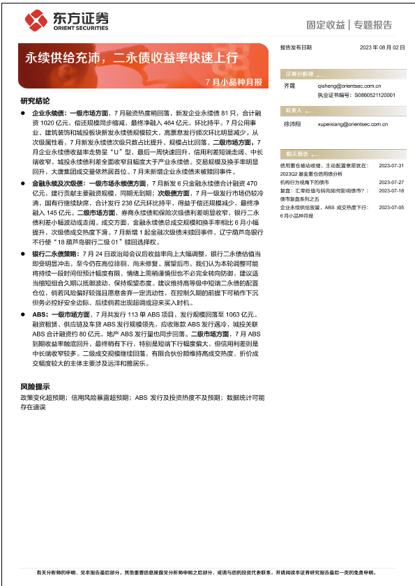 【东方证券】【20230802】7月小品种月报:永续供给充沛,二永债收益率快速上行-20页