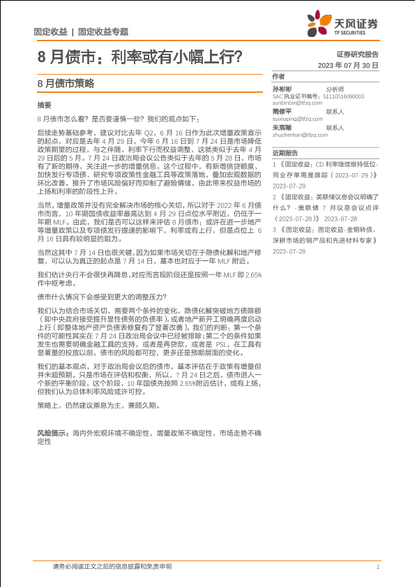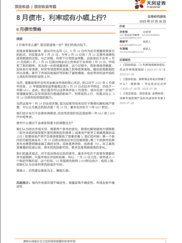【天风证券】【20230730】8月债市策略:8月债市,利率或有小幅上行?-24页