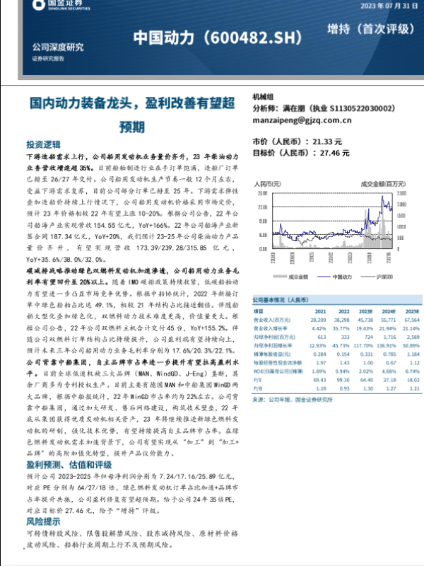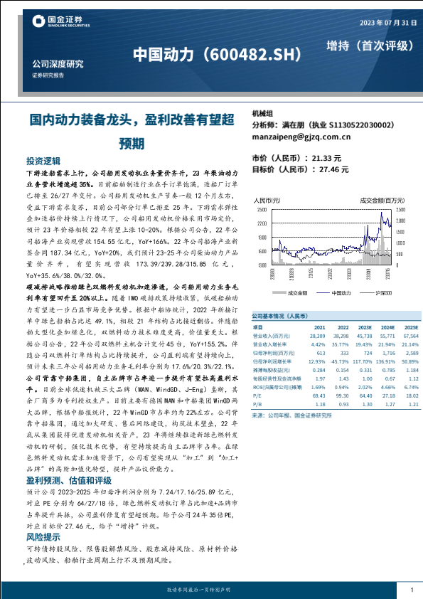 【国金证券】【20230731】中国动力(600482)国内动力装备龙头,盈利改善有望超预期-27页