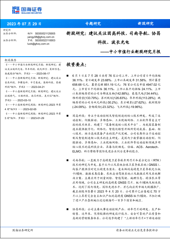 【国海证券】【20230729】中小市值行业新股研究月报:新股研究,建议关注固高科技、司南导航、协昌科技、波长光电-20页