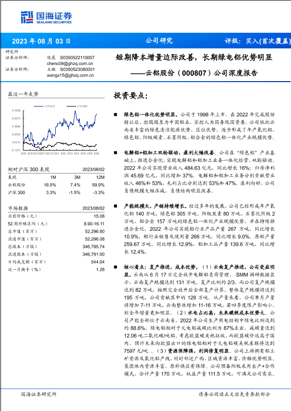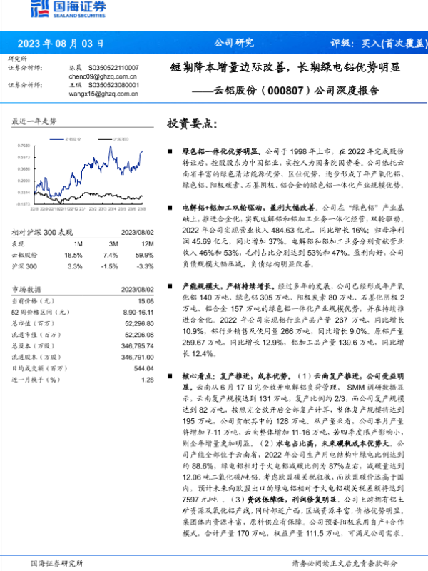 【国海证券】【20230803】云铝股份公司深度报告(000807):短期降本增量边际改善,长期绿电铝优势明显-23页