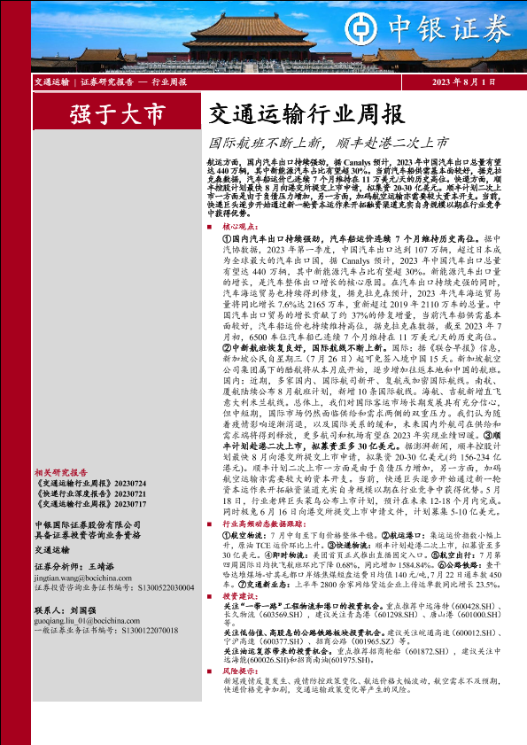 【中银证券】【20230801】交通运输行业周报:国际航班不断上新,顺丰赴港二次上市-30页