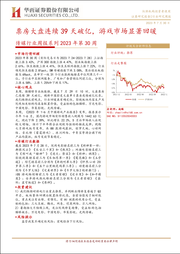 【华西证券】【20230730】传媒行业周报系列2023年第30周:票房大盘连续39天破亿,游戏市场显著回暖-46页