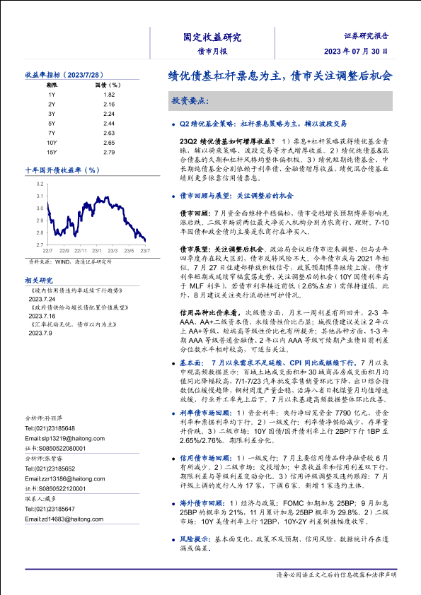 【海通证券】【20230730】债市月报:绩优债基杠杆票息为主,债市关注调整后机会-32页