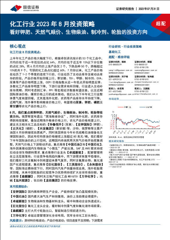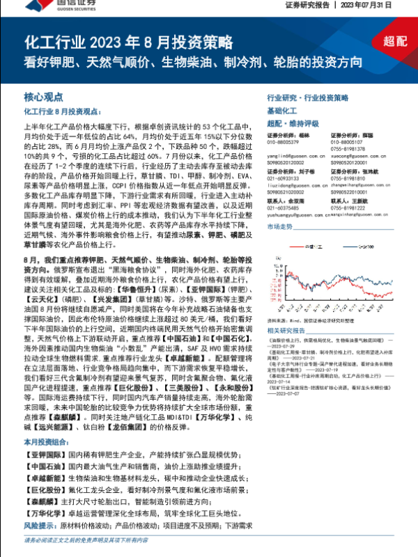 【国信证券】【20230731】化工行业2023年8月投资策略:看好钾肥、天然气顺价、生物柴油、制冷剂、轮胎的投资方向-33页