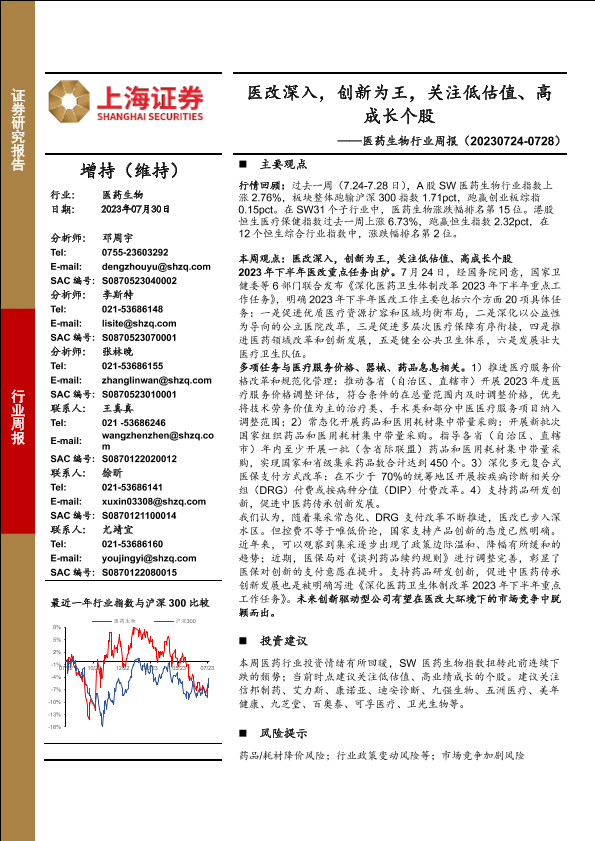 【上海证券】【20230730】医药生物行业周报:医改深入,创新为王,关注低估值、高成长个股-22页