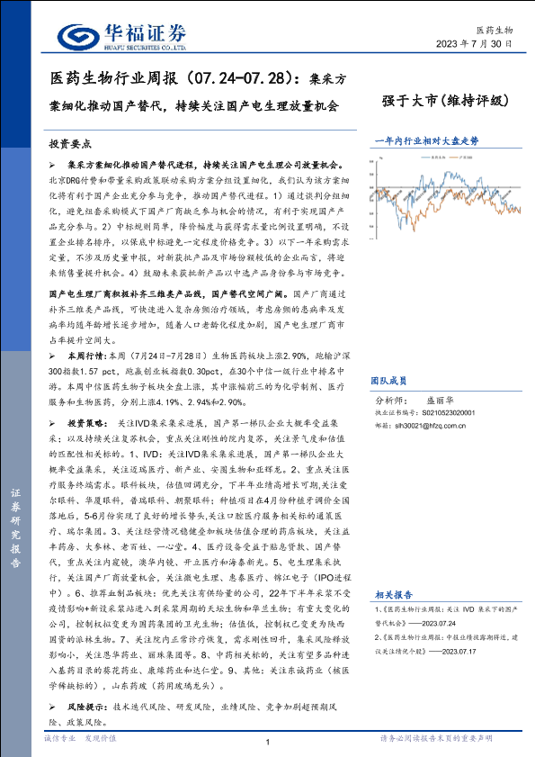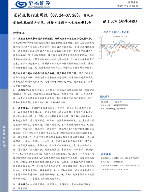 【华福证券】【20230730】医药生物行业周报:集采方案细化推动国产替代,持续关注国产电生理放量机会-15页