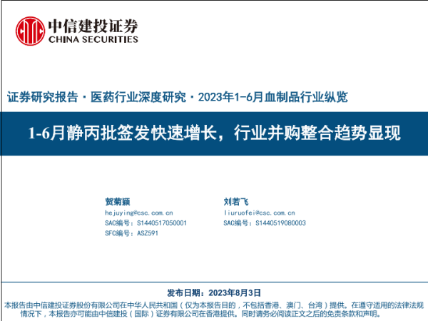 【中信建投证券】【20230803】医药行业深度研究:2023年1_6月血制品行业纵览,1_6月静丙批签发快速增长,行业并购整合趋势显现-68页