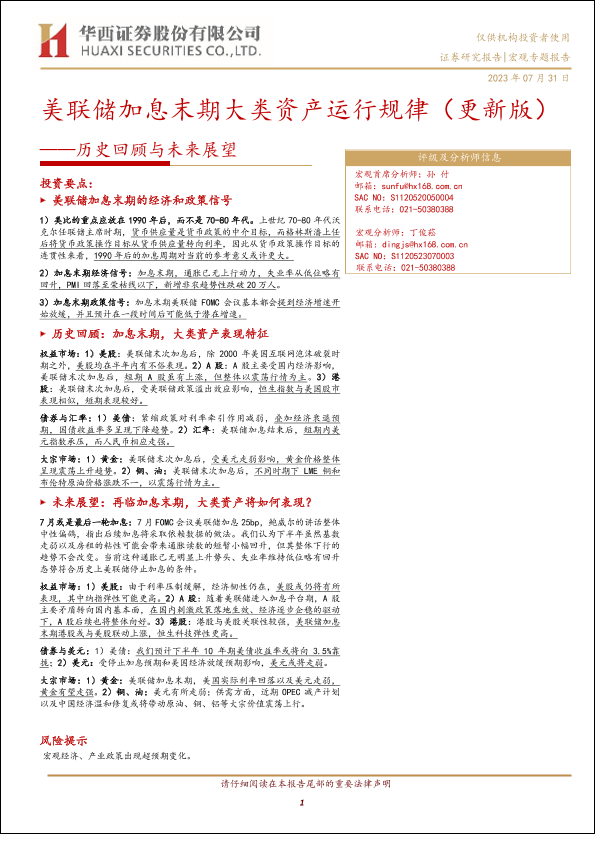 【华西证券】【20230731】历史回顾与未来展望:美联储加息末期大类资产运行规律(更新版)-20页