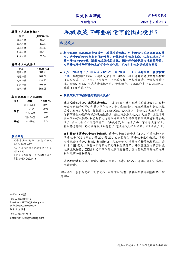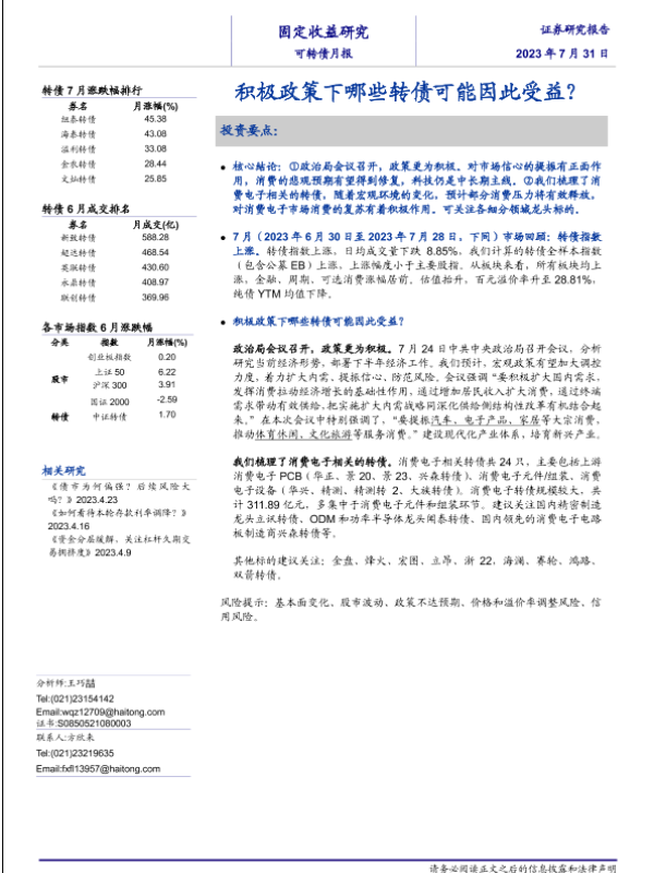 【海通证券】【20230731】可转债月报:积极政策下哪些转债可能因此受益?-20页