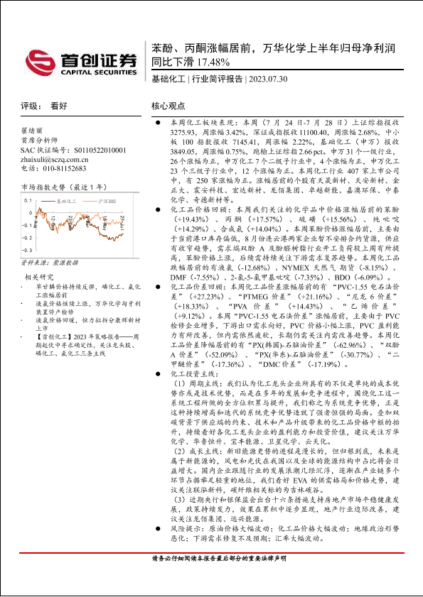 【首创证券】【20230730】基础化工行业简评报告:苯酚、丙酮涨幅居前,万华化学上半年归母净利润同比下滑17.48%-18页