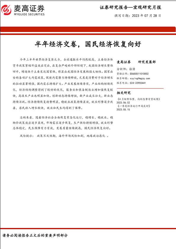 【麦高证券】【20230728】宏观研究月报:半年经济交卷,国民经济恢复向好-20页