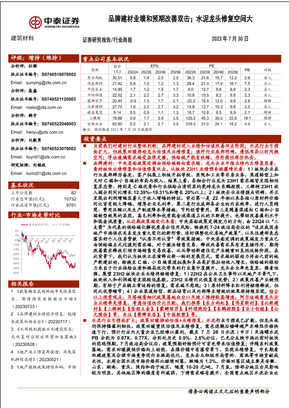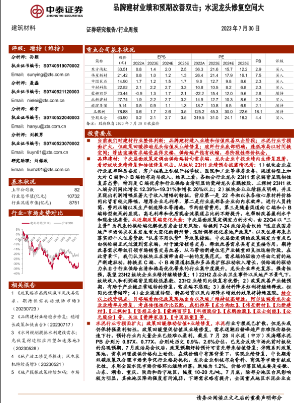 【中泰证券】【20230730】建筑材料行业周报:品牌建材业绩和预期改善双击;水泥龙头修复空间大-24页