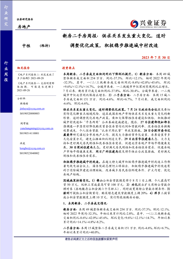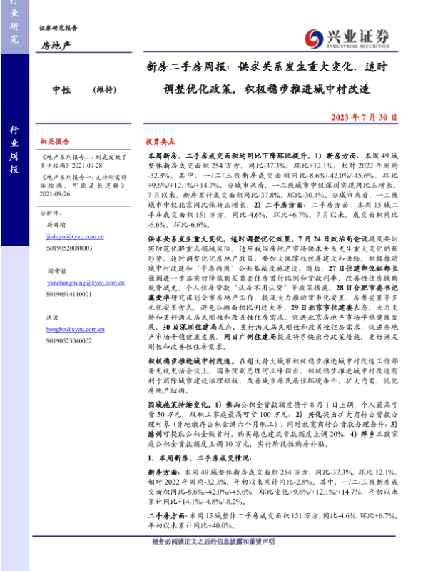 【兴业证券】【20230730】新房二手房周报:供求关系发生重大变化,适时调整优化政策,积极稳步推进城中村改造-26页