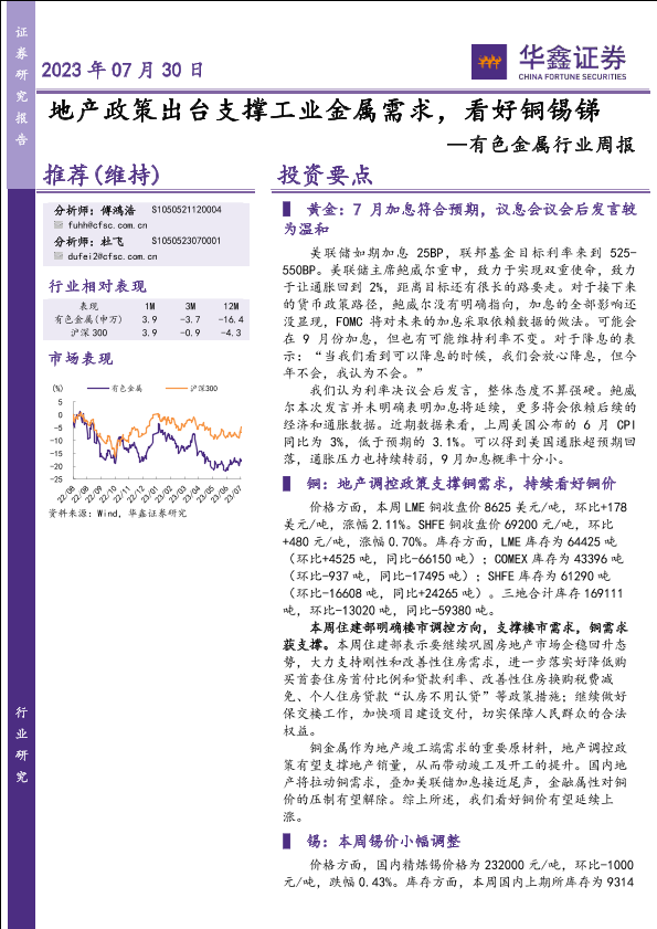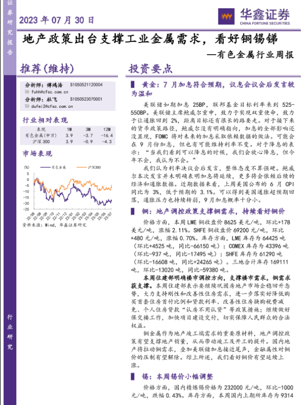 【华鑫证券】【20230730】有色金属行业周报:地产政策出台支撑工业金属需求,看好铜锡锑-15页