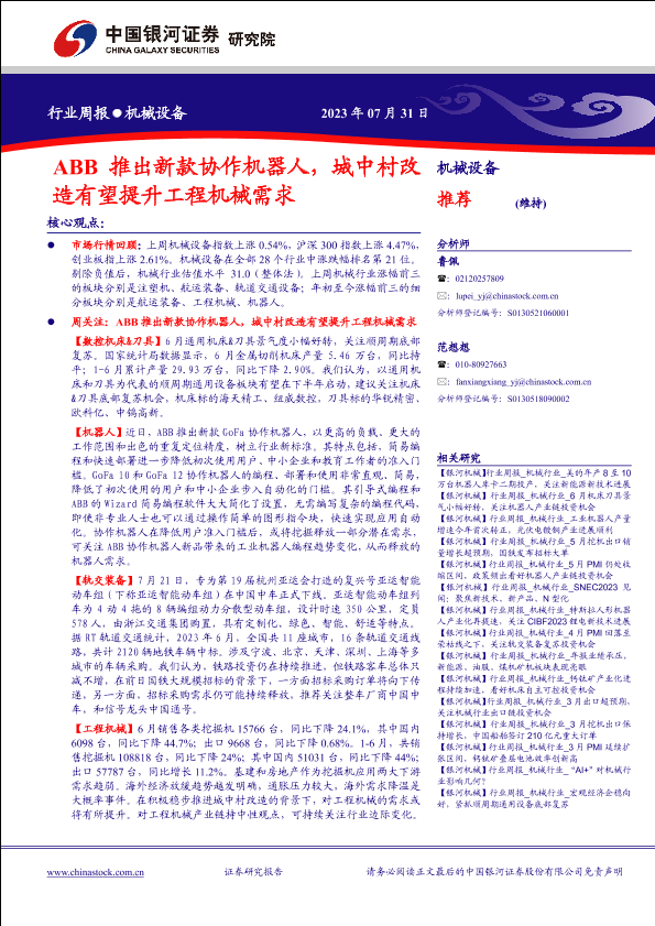 【银河证券】【20230731】机械设备行业周报:ABB推出新款协作机器人,城中村改造有望提升工程机械需求-20页