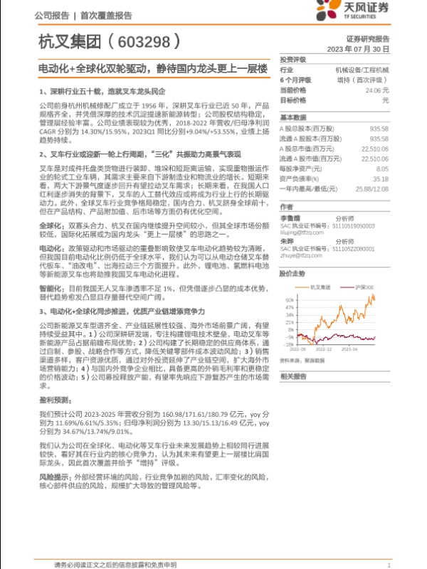 【天风证券】【20230730】杭叉集团-电动化+全球化双轮驱动,静待国内龙头更上一层楼-41页