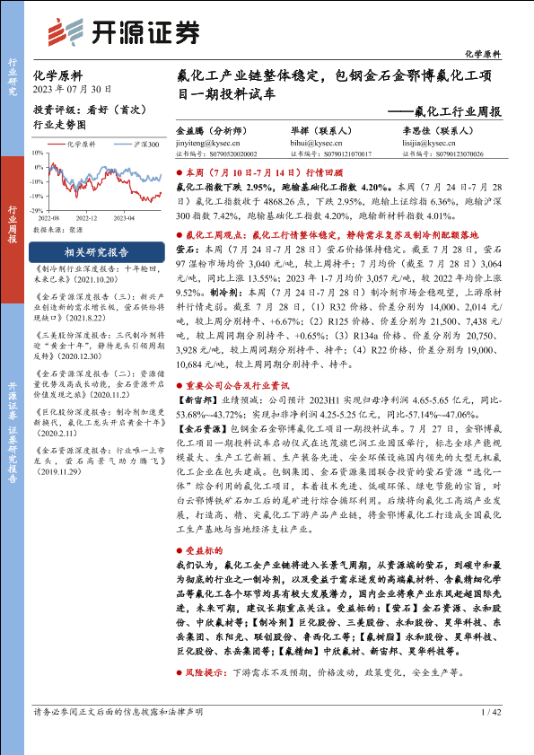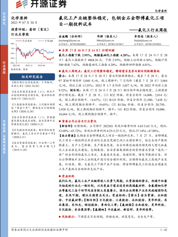 【开源证券】【20230730】氟化工行业周报:氟化工产业链整体稳定,包钢金石金鄂博氟化工项目一期投料试车-42页