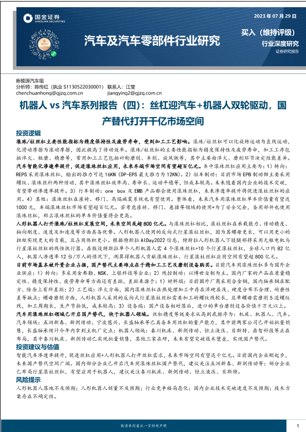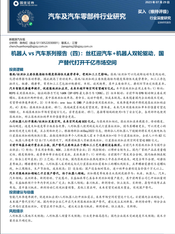 【国金证券】【20230729】汽车及汽车零部件行业研究:机器人vs汽车系列报告(四),丝杠迎汽车+机器人双轮驱动,国产替代打开千亿市场空间-21页