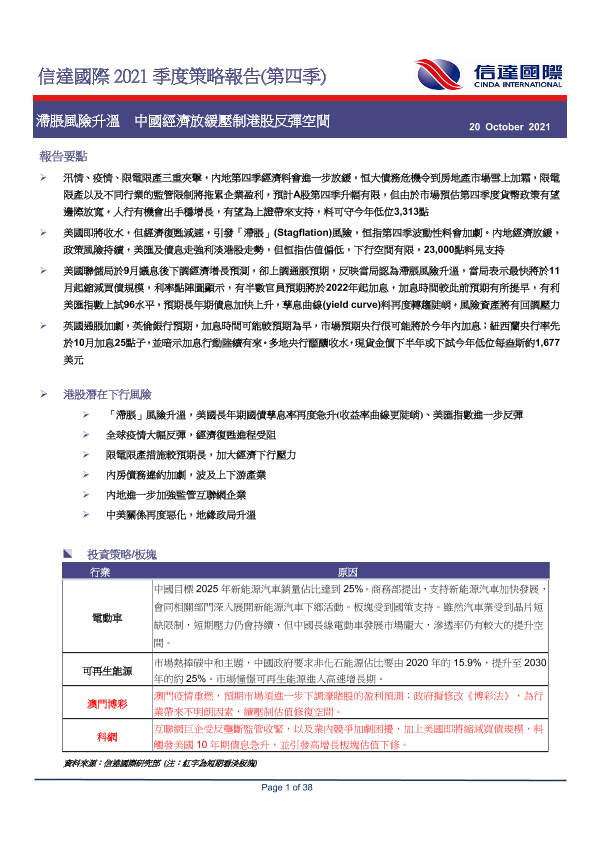 【信达国际】【20211020】2021季度策略报告(第四季):滞胀风险升温,中国经济放缓压制港股反弹空间-46页