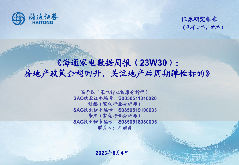 【海通证券】【20230804】海通家电数据周报(23W30):房地产政策企稳回升,关注地产后周期弹性标的-15页