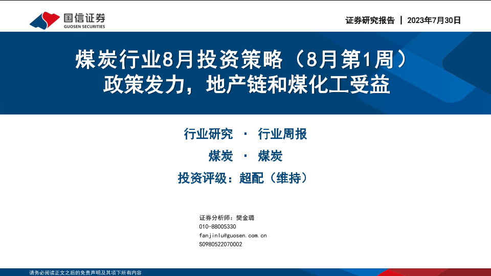 【国信证券】【20230730】煤炭行业8月投资策略(8月第1周):政策发力,地产链和煤化工受益-34页