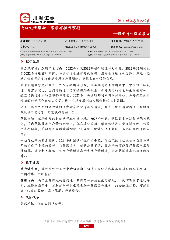 【川财证券】【20230730】煤炭行业深度报告:进口大幅增加,需求有抬升预期-27页