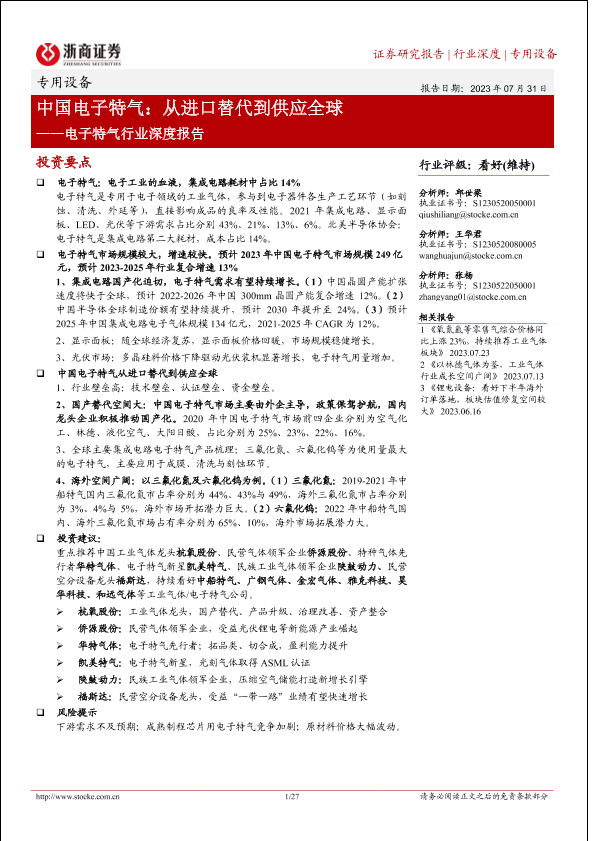 【浙商证券】【20230731】电子特气行业深度报告:中国电子特气,从进口替代到供应全球-27页