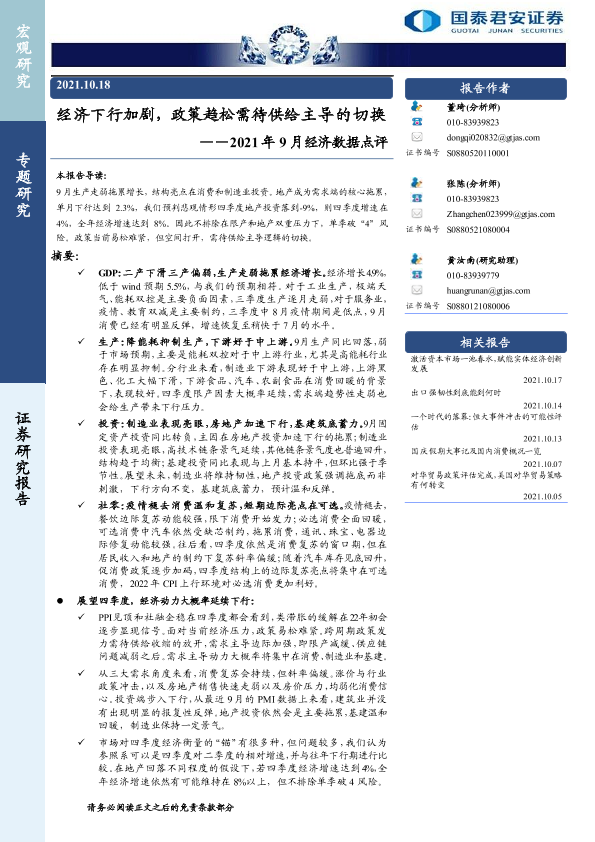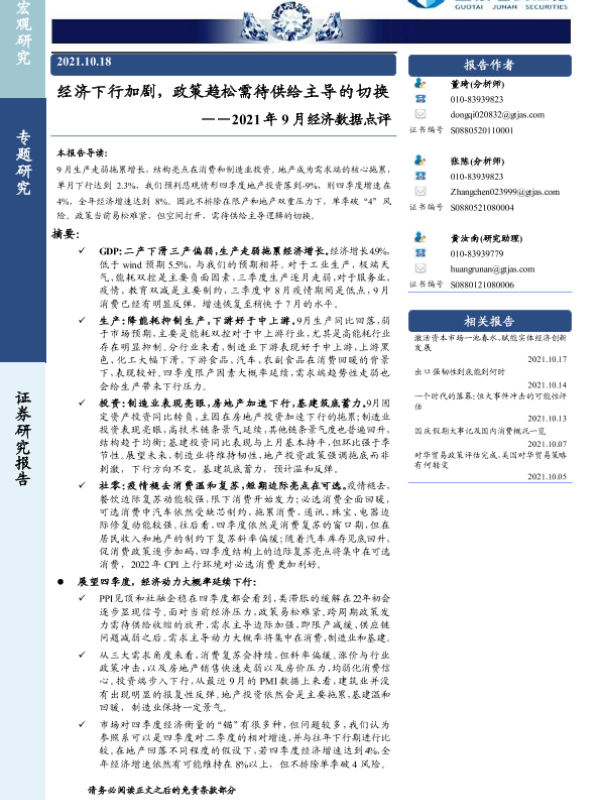【国泰君安证券】【20211018】2021年9月经济数据点评:经济下行加剧,政策趋松需待供给主导的切换-21页