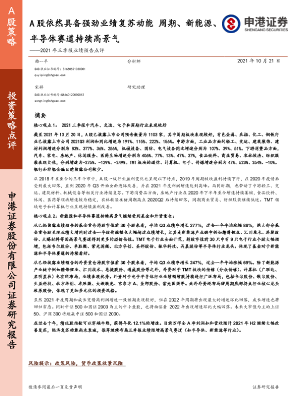【申港证券】【20211021】2021年三季报业绩预告点评:A股依然具备强劲业绩复苏动能,周期、新能源、半导体赛道持续高景气-20页