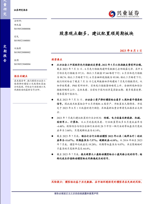 【兴业证券】【20230801】股票观点翻多,建议配置顺周期板块-24页