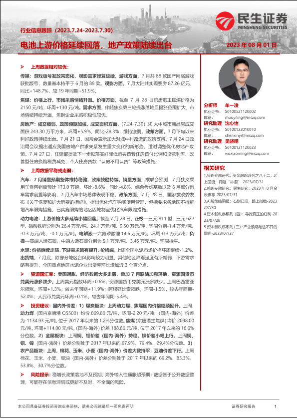 【民生证券】【20230801】行业信息跟踪:电池上游价格延续回落,地产政策陆续出台-30页