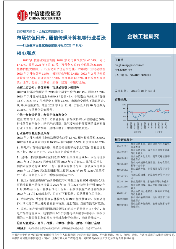 【中信建投证券】【20230803】行业基本面量化模型跟踪月报(2023年8月):市场估值回升,通信传媒计算机等行业看涨-21页