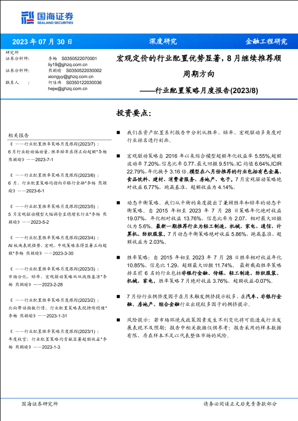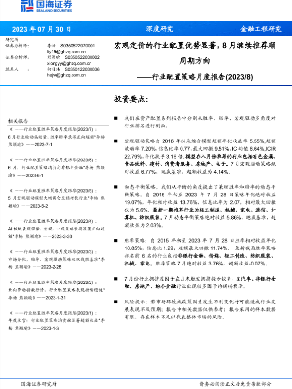【国海证券】【20230730】行业配置策略月度报告:宏观定价的行业配置优势显著,8月继续推荐顺周期方向-15页
