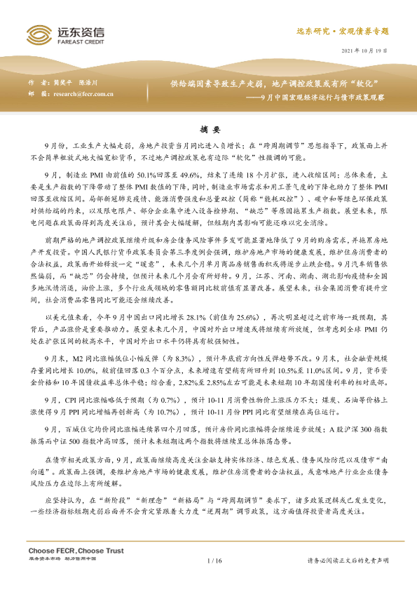 【远东资信】【20211019】9月中国宏观经济运行与债市政策观察:供给端因素导致生产走弱,地产调控政策或有所“软化”-16页