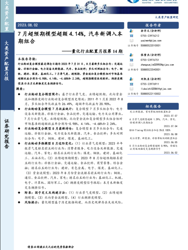 【国泰君安证券】【20230802】量化行业配置月报第14期:7月超预期模型超额4.14%,汽车新调入本期组合-16页