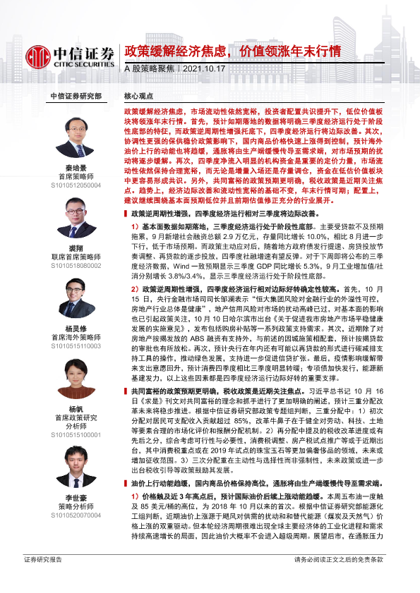 【中信证券】【20211017】A股策略聚焦:政策缓解经济焦虑,价值领涨年末行情-18页
