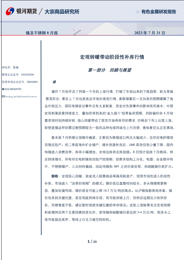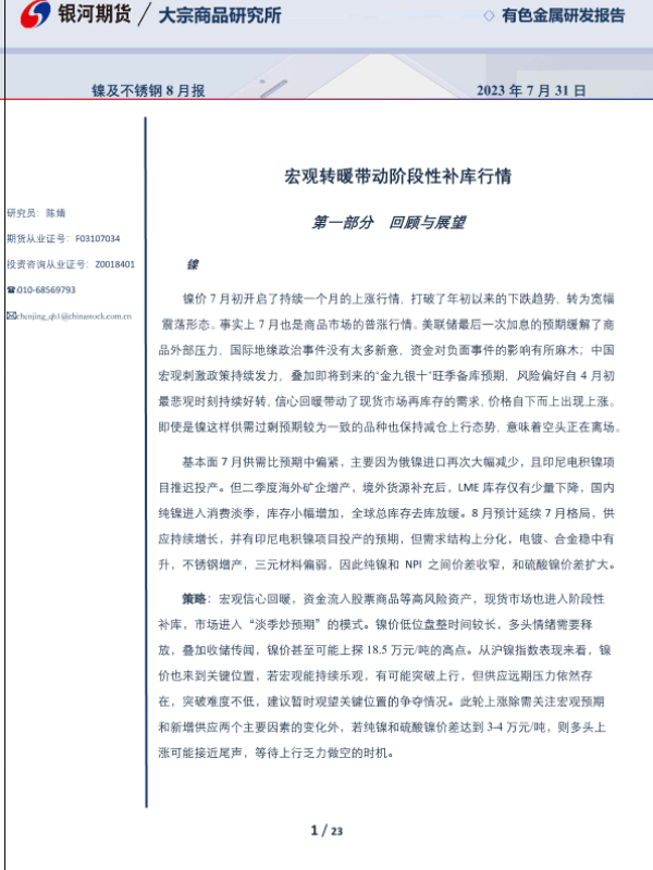 【银河期货】【20230731】镍及不锈钢8月报:宏观转暖带动阶段性补库行情-23页