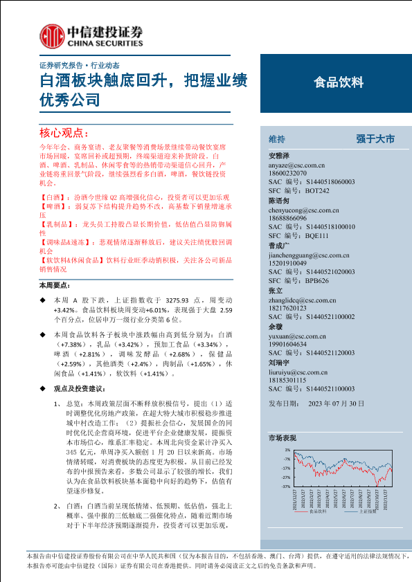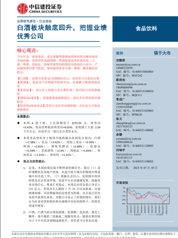 【中信建投证券】【20230730】食品饮料行业:白酒板块触底回升,把握业绩优秀公司-31页
