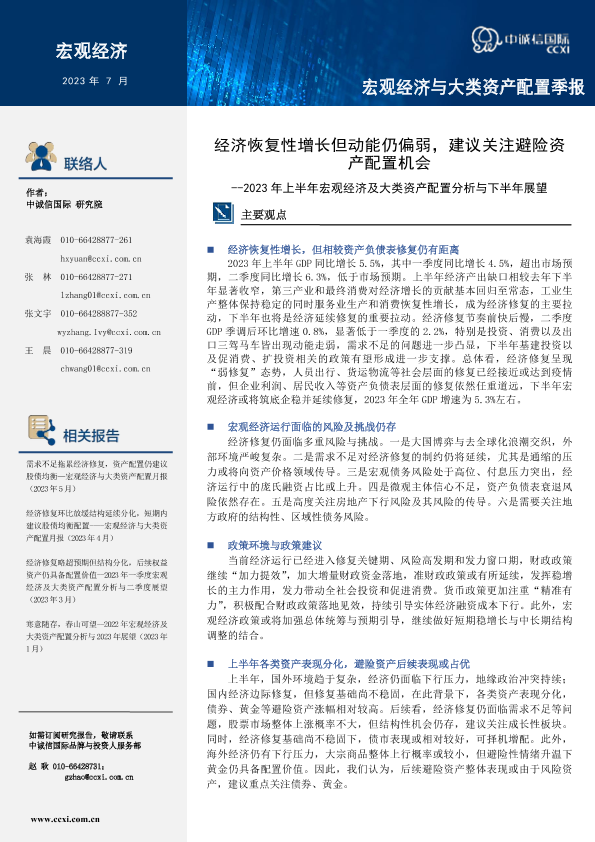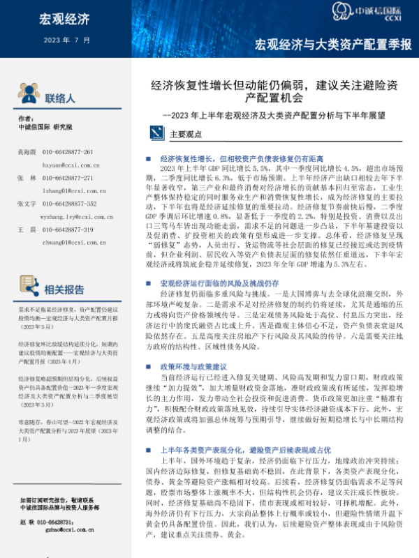 【中诚信国际】【202307】中诚信-2023年上半年宏观季报:经济恢复性增长但动能仍偏弱,建议关注避险资产配置机会-24页