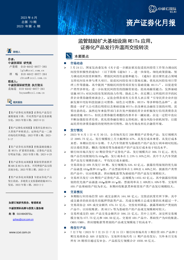 【中诚信国际】【202306】监管鼓励扩大基础设施REITs应用,证券化产品发行升温而交投转淡-25页